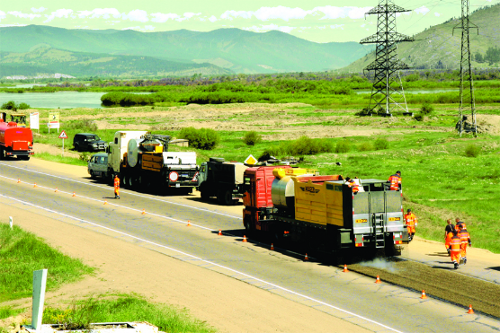 On 7th September,2009,Gaoyuan Shenggong GYKT0812 Fiber Chip Sealer first completed the pavement of 3000㎡fiber sealing testing section in Russia.The first application of fiber sealing technology in Russia achieved a good effect.