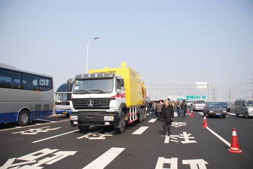作為我國公路養護設備行業的領跑者,河南高遠圣工依靠雄厚的研發實力成功研制成我國首臺排水性路面機能恢復車,成功解決排水性瀝青路面養護難題。此次會議應主辦委員會的邀請,盛裝亮相2010年世博交通論壇既全國排水性路面技術現場研討會,