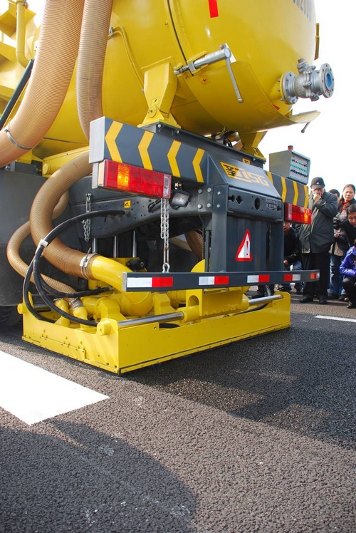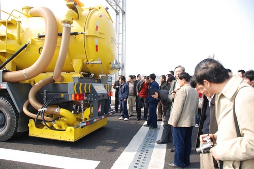 GYPJH2000排水性路面機能恢復車的主要功能是對排水性瀝青路面內部的灰塵、泥沙等堵塞雜物的清理和對清理出來的雜物進行回收,從而保證排水性路面的排水功能符合設計要求,使路面被堵塞的排水機能得以恢復,實現對路面的養護目的。為大程度加深與會代表對排水路面技術的認識和理解,大會還專程組織了現場觀摩,高遠圣工GYPJH2000排水性路面機能恢復車在上海世博園區排水路面進行現場清洗養護作業。