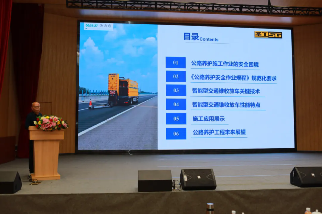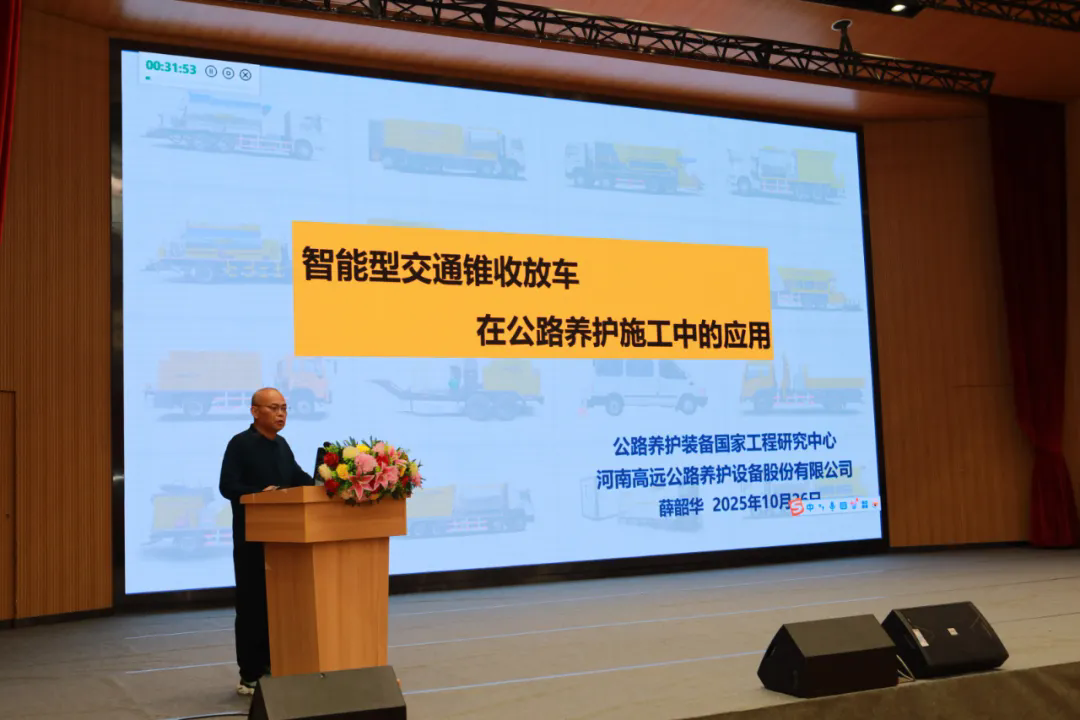 學術交流會上,河南高遠公路養護設備股份有限公司工程師薛韶華以智能型交通錐收放車在公路養護施工中的應用為主題,以具體的施工應用案例展開詳細講解,分享技術成果與實踐經驗。該產品在我公司原有交通錐收放車基礎上經優化、改進而成,充分考慮用戶在實際運用中的需求,應用了交通錐智能碼垛機器人及新一代智能操控系統,能夠完成交通錐連貫性的斜線+直線的自動布放和回收,實現不同車道的布放要求。在道路養護領域,交通錐的布放與回收一直是保障施工安全與交通秩序的關鍵環節,傳統人工作業方式效率低下,危險性高,難以滿足現代高速交通的需求。智能型交通錐收集工程車的廣泛應用,使道路養護作業區的布設更加高效、安全。